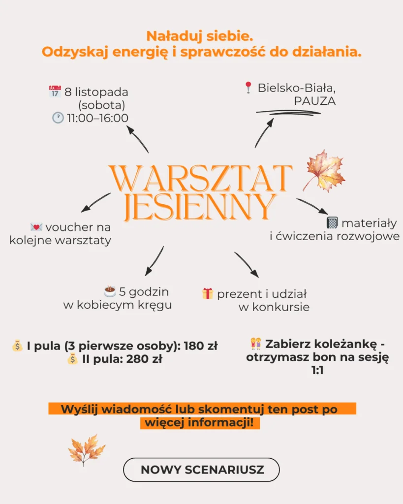 Zapraszamy na warsztat jesienny ,,Naładuj siebie. Odzyskaj energię i sprawczość do działania!”, który odbędzie się 8 listopada (sobota) w godz. 11.00-16.00 pod okiem Martyny Malinowskiej.