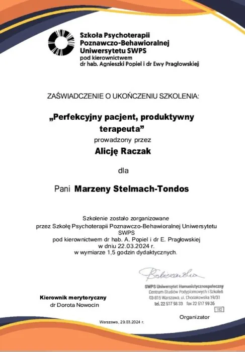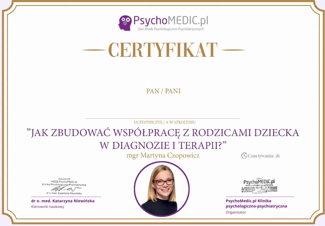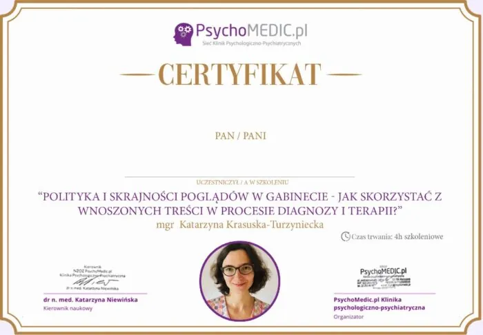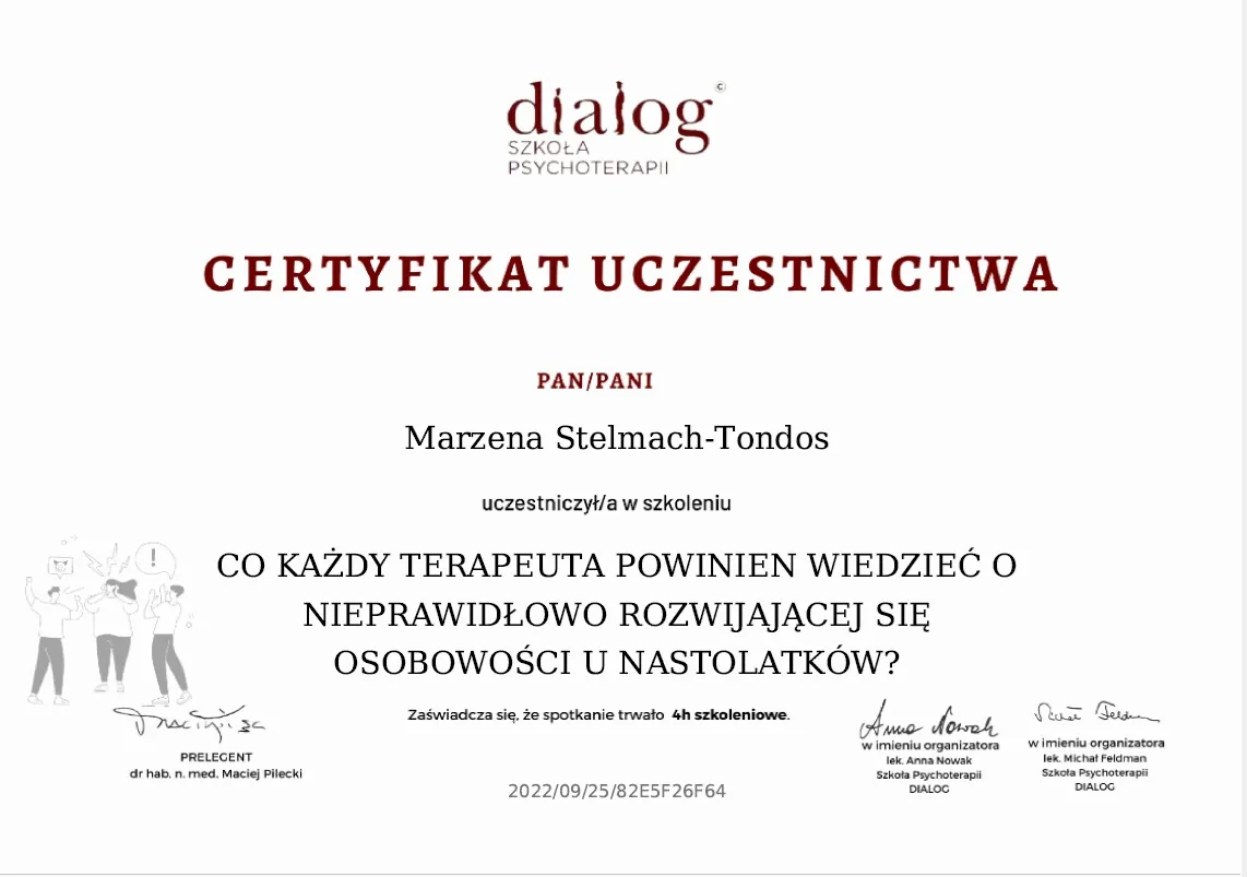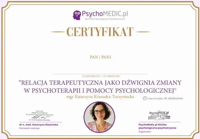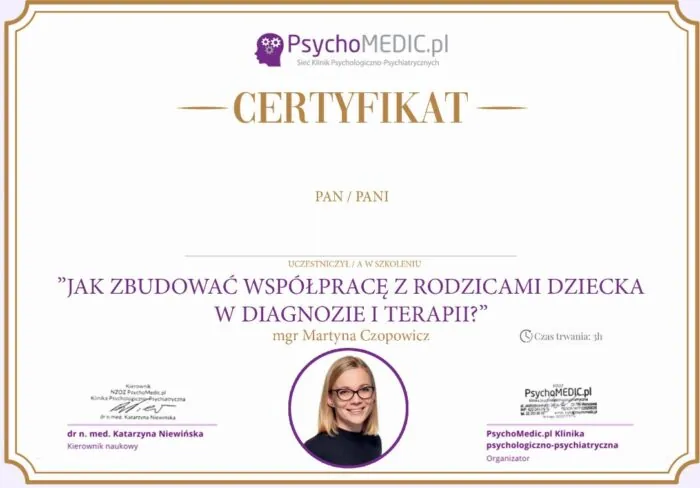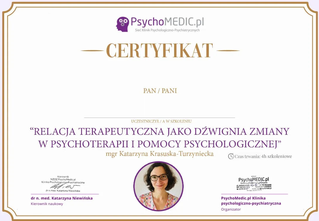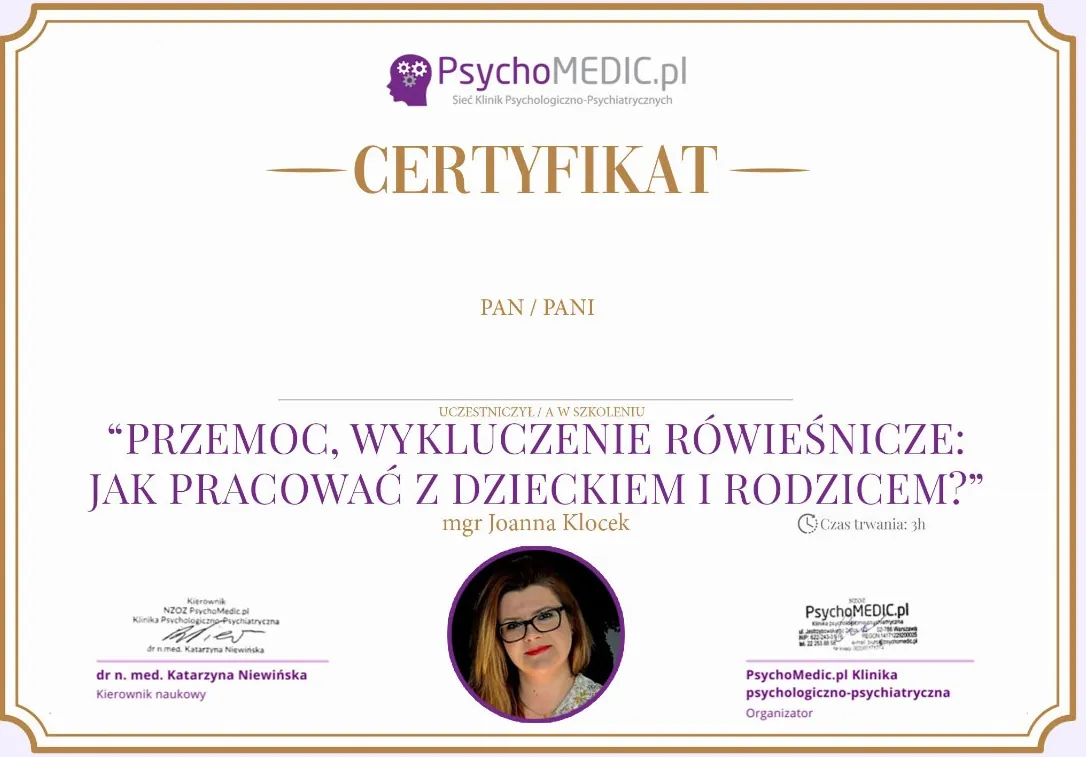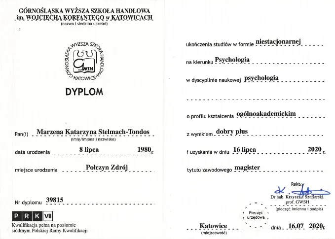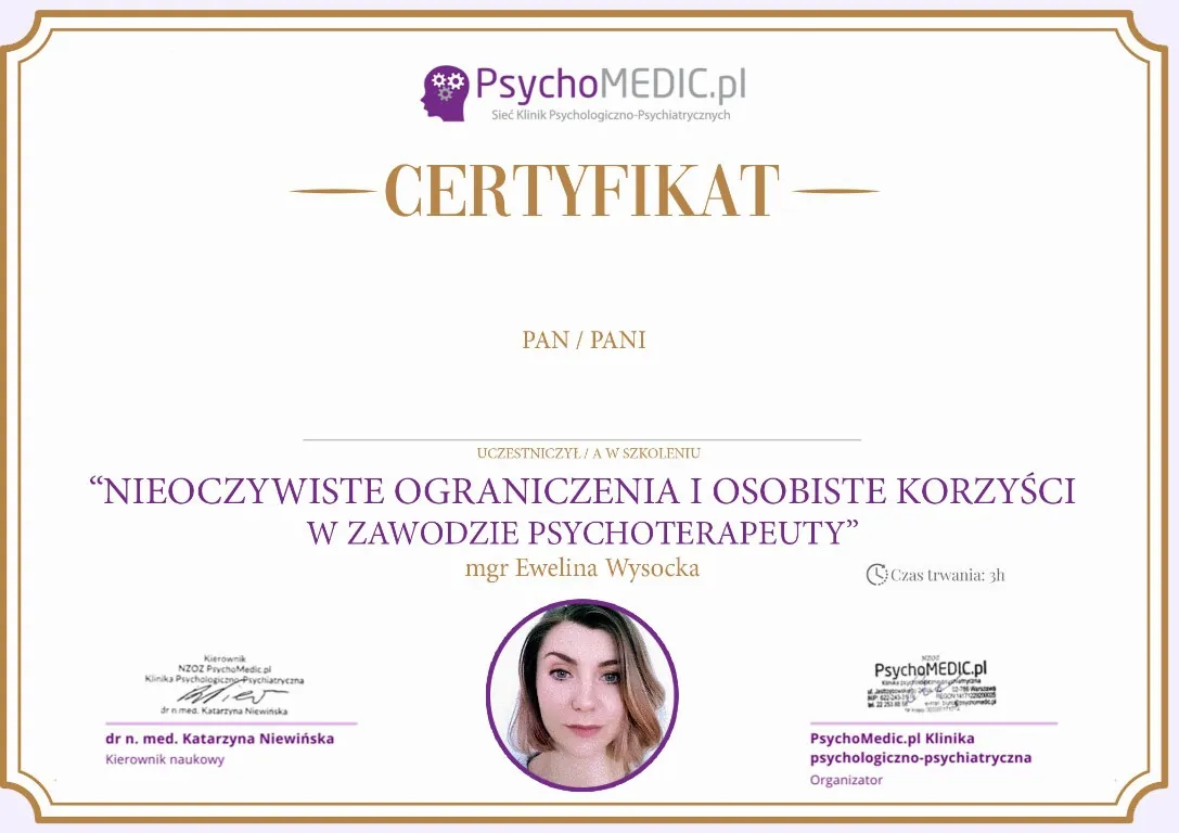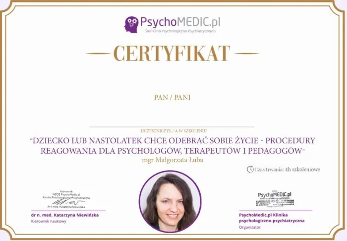 Jestem magistrem psychologii, seksuolożką oraz certyfikowaną psychoterapeutką. Posiadam certyfikat z psychoterapii w szkole Poznawczo-Behawioralnej na Uniwersytecie SWPS pod kierownictwem Ewy Pragłowskiej i Agnieszki Popiel. Swoją pracę od zawsze wiązałam z dziećmi i młodzieżą, wspomagałam rodziców w trudnej sztuce i ciężkiej pracy jaką jest wychowanie dziecka. Prywatnie mama dwóch nastolatków będących także źródłem cennych informacji i doświadczeń.