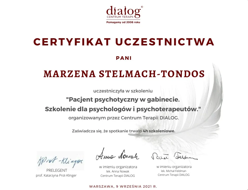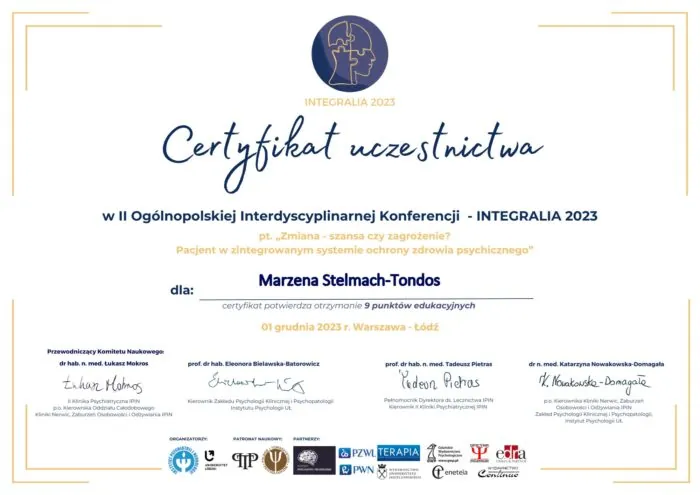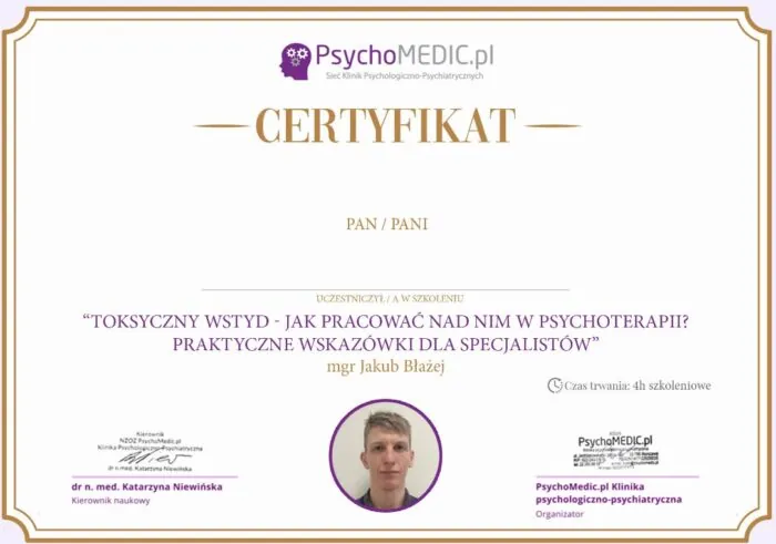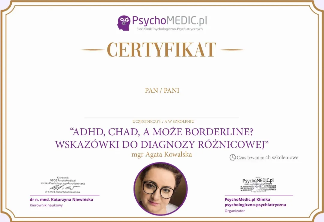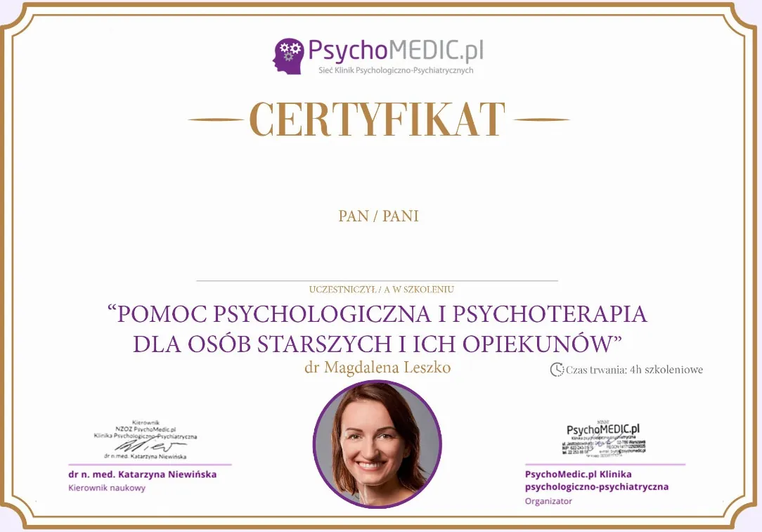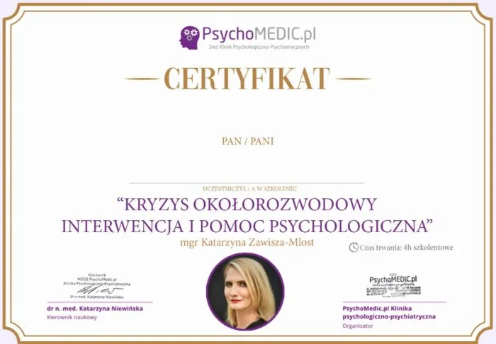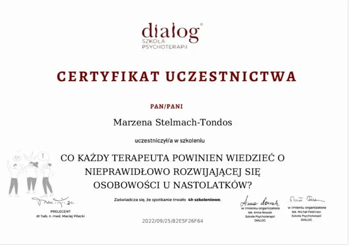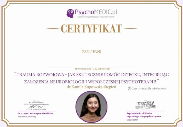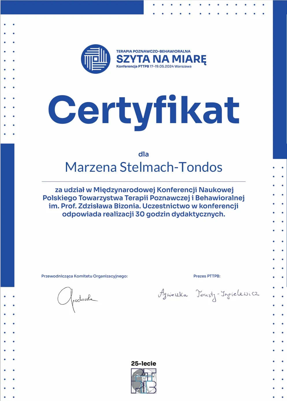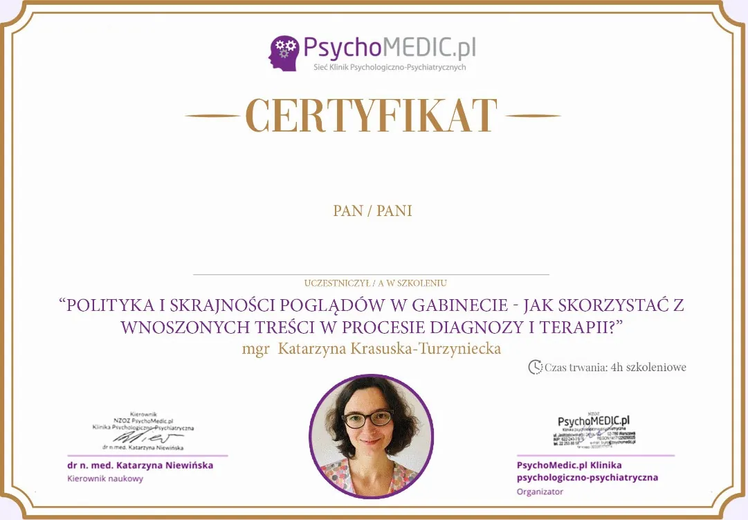 Jestem magistrem psychologii, seksuolożką oraz certyfikowaną psychoterapeutką. Posiadam certyfikat z psychoterapii w szkole Poznawczo-Behawioralnej na Uniwersytecie SWPS pod kierownictwem Ewy Pragłowskiej i Agnieszki Popiel. Swoją pracę od zawsze wiązałam z dziećmi i młodzieżą, wspomagałam rodziców w trudnej sztuce i ciężkiej pracy jaką jest wychowanie dziecka. Prywatnie mama dwóch nastolatków będących także źródłem cennych informacji i doświadczeń.