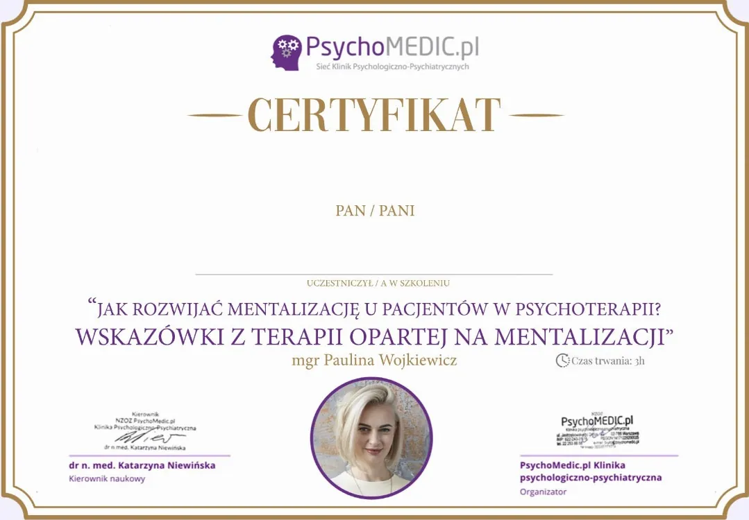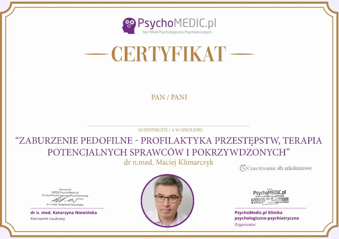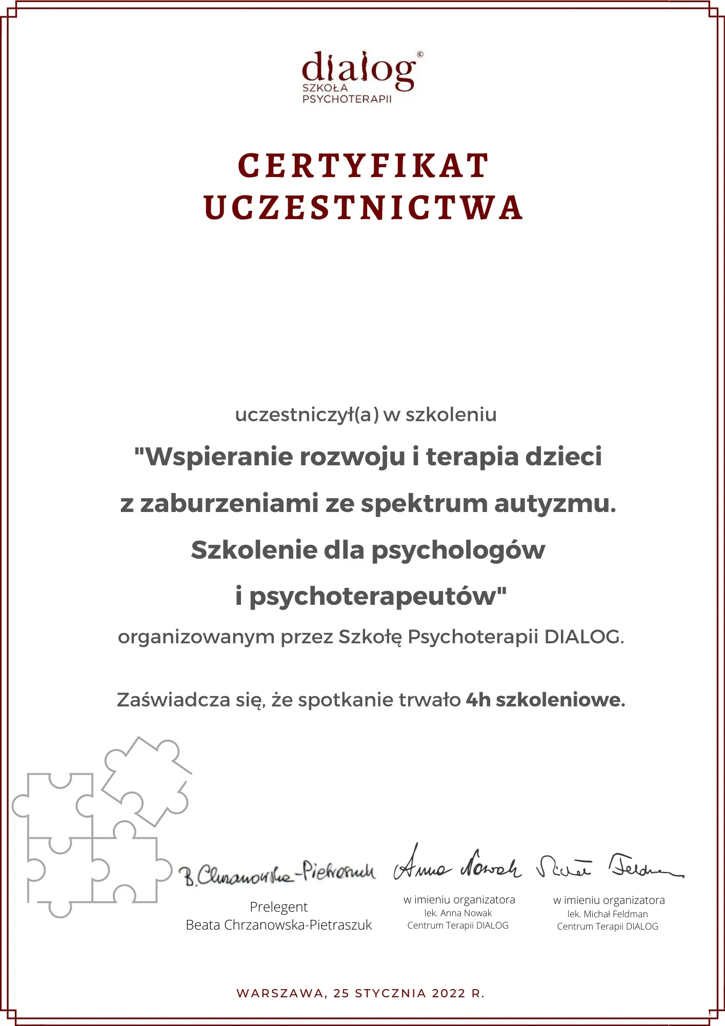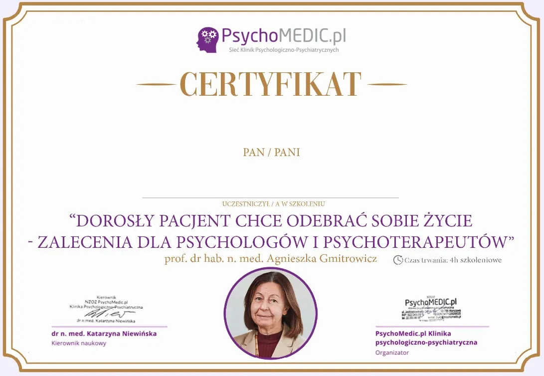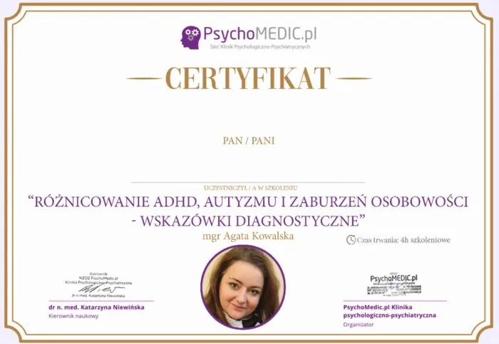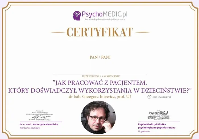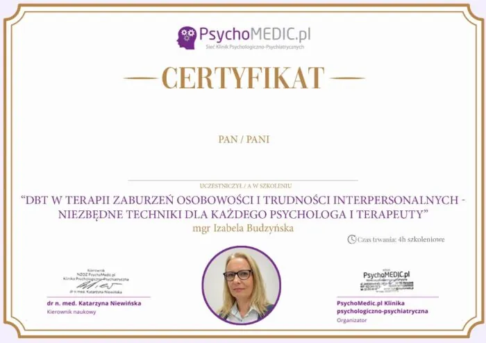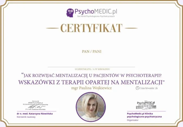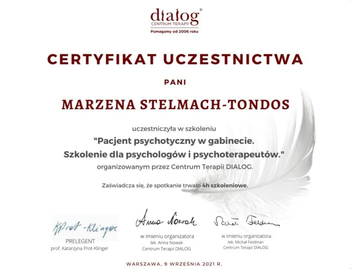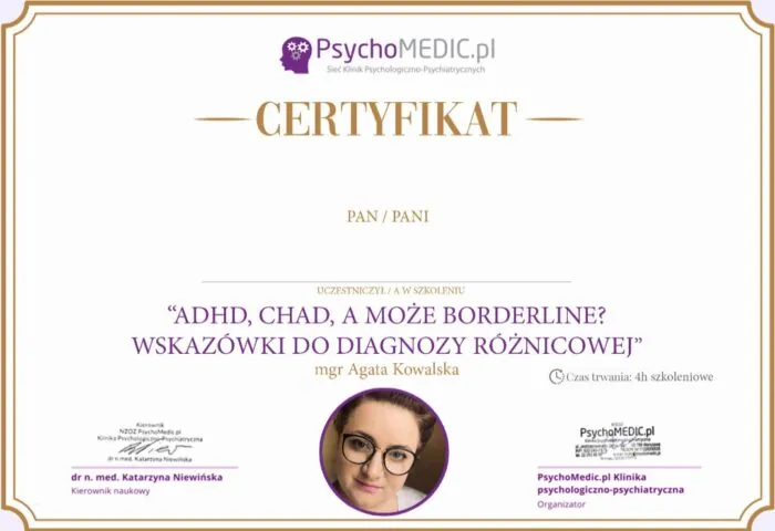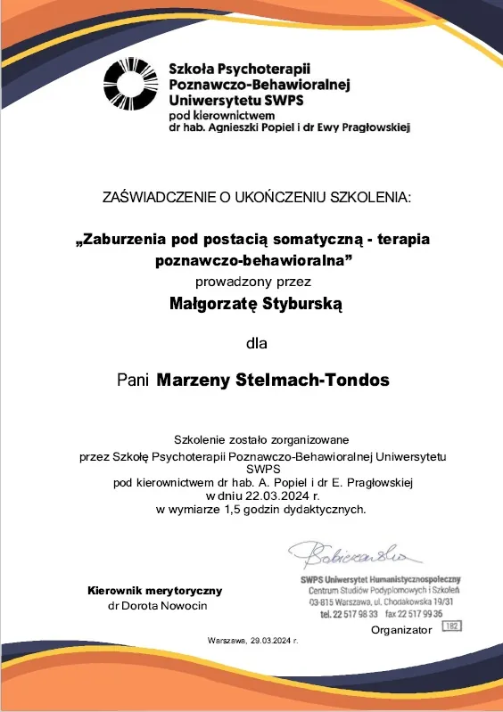 Jestem magistrem psychologii, seksuolożką oraz certyfikowaną psychoterapeutką. Posiadam certyfikat z psychoterapii w szkole Poznawczo-Behawioralnej na Uniwersytecie SWPS pod kierownictwem Ewy Pragłowskiej i Agnieszki Popiel. Swoją pracę od zawsze wiązałam z dziećmi i młodzieżą, wspomagałam rodziców w trudnej sztuce i ciężkiej pracy jaką jest wychowanie dziecka. Prywatnie mama dwóch nastolatków będących także źródłem cennych informacji i doświadczeń.